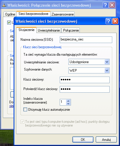 Naciskamy przycisk Dodaj, następnie w polu Nazwa sieciowa (SSID) wprowadzamy nazwę pod jaką nasza sieć będzie widziana przez innych. Odznaczamy na dole opcję Otrzymuję klucz automatycznie. Jako Uwierzytelnianie sieciowe wybieramy Udostępnione, a jako Szyfrowanie danych - WEP. Następnie wprowadzamy Klucz sieciowy jakim będą musiały posłużyć się osoby, które chcą dołączyć się do naszej sieci.