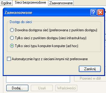 Gdy już poprawnie zainstalujemy karty sieciowe, możemy przystąpić do konfiguracji samej sieci. Jeden z komputerów, będzie pełnił rolę punktu dostępowego (z nim będą łączyć się pozostałe komputery), zaczynamy od konfigurowania właśnie niego. Przechodzimy do Panelu sterowania, dalej wybieramy Połączenia sieciowe, wchodzimy we właściwości naszego połączenia bezprzewodowego, wybieramy zakładkę Ogólne i wchodzimy we właściwości protokołu TCP/IP. Wpisujemy adres IP, np.: 192.168.2.1 i maskę: 255.255.255.0, zatwierdzamy wprowadzone dane i przechodzimy do zakładki Sieci bezprzewodowe. Klikamy na przycisk zaawansowane i w ramce Dostęp do sieci zaznaczamy opcję Tylko sieci typu komputer-komputer (ad hoc), klikamy Zamknij.