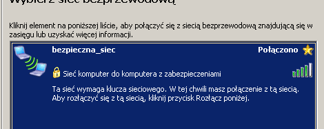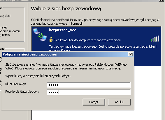 Po zamontowaniu w komputerze bezprzewodowej karty sieciowej i zainstalowaniu sterowników, możemy łączyć się z wcześniej stworzoną przez nas siecią. Wchodzimy w Połączenia sieciowe poprzez Panel sterowania, następnie klikamy prawym na Połączenie sieci bezprzewodowej powinny wyświetlać się nam dostępne sieci bezprzewodowe, w tym także nasza, łączymy się z nią i wprowadzamy klucz WPA, który ustaliliśmy wcześniej.