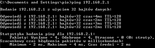 Wynika z tego że komputer - punkt dostępowy komunikuje się z komputerem - klientem. Należy sprawdzić to jeszcze w drugą stronę, na komputerze kliencie uruchamiamy wiersz poleceń i wpisujemy ping IP_PUNKTU_DOSTĘPOWEGO: