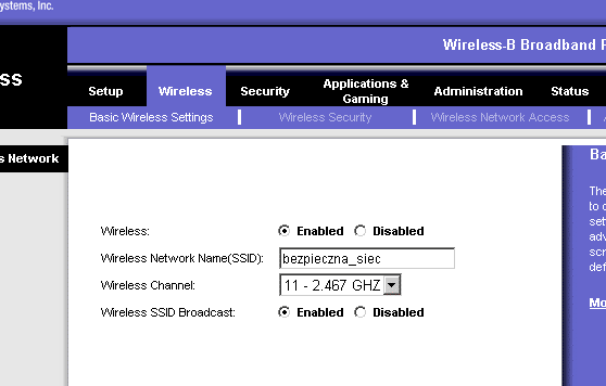 Aby przystąpić do konfiguracji naszego punktu dostępowego, najpierw należy połączyć go za pomocą przewodu sieciowego z kartą sieciową znajdującą się w naszym komputerze. Jeżeli acces point nie przydzieli adresu IP dynamicznie, należy zrobić to ręcznie. Ustawiamy wtedy adres z tego samego przedziału co adres punktu dostępowego (np. jeśli adres IP punktu to 192.168.1.1 to karta powinna mieć np. 192.168.1.2). Acces point konfiguruje się za pomocą jego strony internetowej. Wpisujemy więc w przeglądarkę jego adres IP, powinno wyświetlić się nam okno logowania wpisujemy tam użytkownika i hasło, które da nam możliwość przystąpienia do konfiguracji (znajdziemy je w instrukcji urządzenia). Po zalogowaniu się, możemy przystąpić do konfiguracji. Na początku powinniśmy zmienić domyśle hasło dostępu, w moim przypadku znajduje się to w Administration > Management, po zmianie ponownie się logujemy. Wchodzimy w Setup > Basic Setup, wybieramy tam typ połączenia z Internetem i konfigurujemy go zgodnie z instrukcjami naszego dostawcy Internetu. W tym samym menu konfigurujemy router od strony sieci lokalnej, w Local IP Address ustalamy adres IP pod jakim będzie widoczny acces point w naszej sieci lokalnej, możemy także włączyć lub wyłączyć usługę DHCP (automatyczne przydzielenie adresów IP). Zapisujemy ustawienia przyciskiem Save Settings. Przechodzimy do konfiguracji łączności bezprzewodowej Wireless > Basic Wireless Settings, włączamy ją (Enabled), jako SSID wpisujemy nazwę nasze sieci, wybieramy kanał, na którym zamierzamy pracować (najlepiej gdy będzie on inny od otaczających nas sieci), rozgłaszanie (Wireless SSID Broadcast) zostawiamy włączone (Enabled). Klikamy przycisk Save Settings.