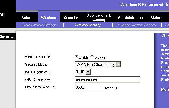 Przystępujemy do zabezpieczenia naszej sieci Wireless > Wireless Security, włączmy opcję Wireless Security, jako tryb zabezpieczeń (Security Mode) wybieramy WPA Pre-Shared Key, w okienko WPA Shared Key wpisujemy hasło, które będzie nam potrzebne do podłączenia się z naszą siecią. Zapisujemy zmiany poprzez kliknięcie na Save Settings.