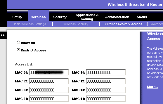 Przechodzimy do zakładki Wireless Network Access aby włączyć kolejne zabezpieczenie. Jest to zabezpieczenie dostępu polegające na kontroli adresów fizycznych (MAC) kart sieciowych, zaznaczamy opcję dostęp ograniczony (Restrict Access) i w poniższe okienka wpisujemy adresy MAC kart sieciowych, które będą pracować w naszej sieci.